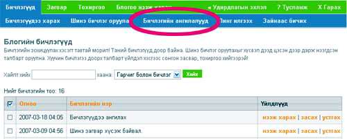 Та өөрийн бичлэгүүдээ ангилал үүсгэн ангилж болно. Үүний тулд өөрийн бичлэгээ ангилах блогоо сонгож ороод Бичлэгүүд хэсгээс Бичлэгийн ангилалууд гэсэн хуудсыг нээгээрэй.
